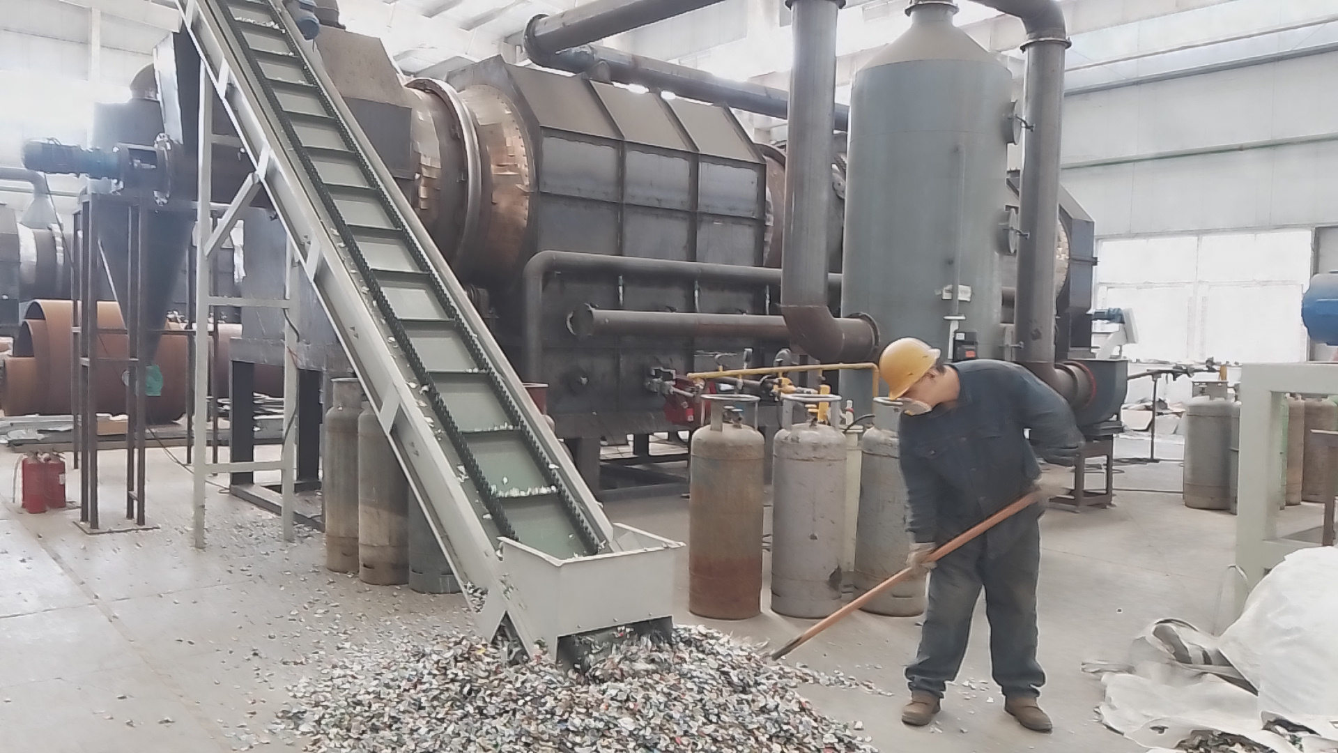 預(yù)處理破碎:易拉罐在進(jìn)入爐內(nèi)前需要預(yù)先破碎成小片,通常大小約為2公分左右。這有助于增加物料的表面積,從而提高熱解效率。